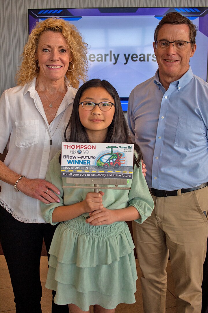 Three winners for each grade level were selected by Thompson's panel of judges, and those 21 winners were invited to Thompson Toyota to celebrate their accomplishments and claim their prizes at an awards ceremony on Thursday, April 13, 2023. Each winner also received a commemorative 2023 Draw the Future t-shirt at the ceremony. Our Grand Prize winner, Sulan Shi's artwork is currently on display on a billboard located on Durham Rd. (Rt. 413) in Newtown, PA, 0.5 miles south of Rt. 232.