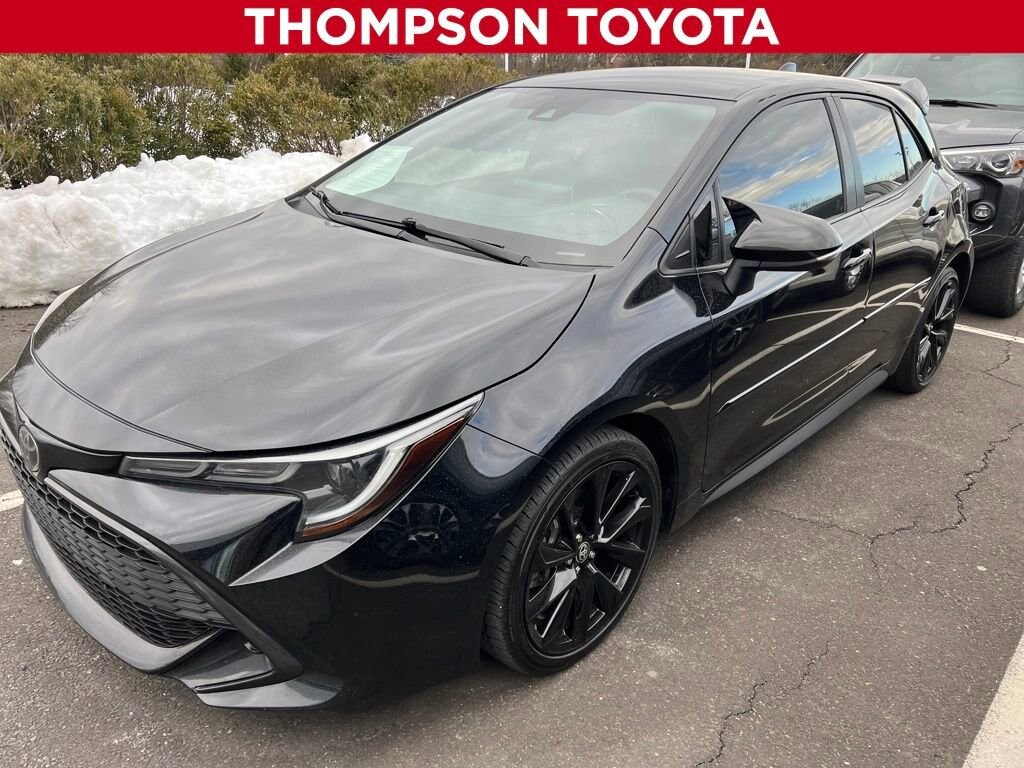 Thompson Toyota is pleased to offer you a True Market Priced Vehicle. This 2021 Toyota Corolla Hatchback SE Nightshade Edition comes equipped with notable features like: All-Weather Floor Liner Package (TMS) (All-Weather Floor Liners (TMS)), Nightshade Package, 4-Wheel Disc Brakes, 6 Speakers, ABS brakes, Air Conditioning, Alloy Wheel Locks (TMS) (PPO), Alloy wheels, AM/FM radio: SiriusXM, Apple CarPlay/Android Auto, Auto High-beam Headlights, Automatic temperature control, Body Side Moldings (TMS), Brake assist, Bumpers: body-color, Compass, Delay-off headlights, Driver door bin, Driver vanity mirror, Dual front impact airbags, Dual front side impact airbags, Electronic Stability Control, Emergency communication system: Safety Connect with 1-year trial, Exterior Parking Camera Rear, Fabric Upholstery, Four wheel independent suspension, Front anti-roll bar, Front Bucket Seats, Front Center Armrest, Front reading lights, Heated door mirrors, Illuminated entry, Knee airbag, Leather Shift Knob, Low tire pressure warning, Occupant sensing airbag, Outside temperature display, Overhead airbag, Overhead console, Panic alarm, Passenger door bin, Passenger vanity mirror, Power door mirrors, Power steering, Power windows, Preferred Owners Portfolio (TMS), Radio data system, Radio: Audio, Rear anti-roll bar, Rear seat center armrest, Rear side impact airbag, Rear window defroster, Rear window wiper, Remote keyless entry, Removable Cross Bars (TMS), Security system, Speed control, Speed-sensing steering, Split folding rear seat, Spoiler, Sport Front Seats, Steering wheel mounted audio controls, Tachometer, Telescoping steering wheel, Tilt steering wheel, Traction control, Trip computer, Turn signal indicator mirrors, Variably intermittent wipers, and Wheels: 18" Black Metallic Painted Aluminum.